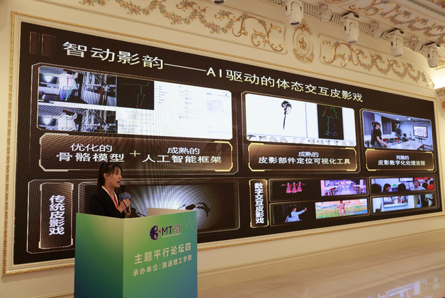 皇甫永仙同学携项目《智动影韵—AI驱动的体态交互皮影戏》亮相论坛。该项目是数字媒体艺术、视觉传达设计、产品设计多专业学生跨界协作的结晶。在团队指导教师的全程协助下,同学们历经六次功能迭代、耗时一年半打磨,成功将AI体态识别技术与数字化内容制作深入融合,为传统皮影戏赋予了“可交互、可体验” 的新形态。